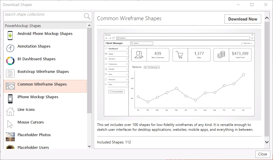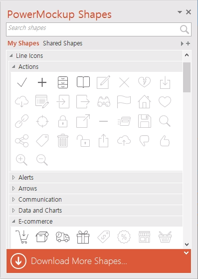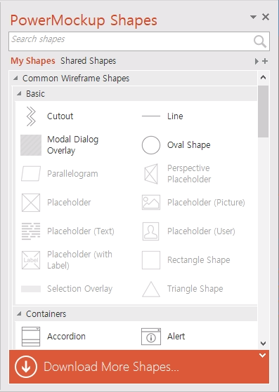 처음에 설치한 후에는 상단 메뉴 탭에서 PowerMockup을 선택 후 가장 왼쪽의 메뉴를 선택하면 문서작성에 필요한 Shapes 항목들을 확인할 수 있습니다. 하단의 Download More Shapes를 클릭하면 팝업창이 열리면서 PowerMockup에서 다운로드하여 사용 가능한 데이터들이 확인 가능합니다.