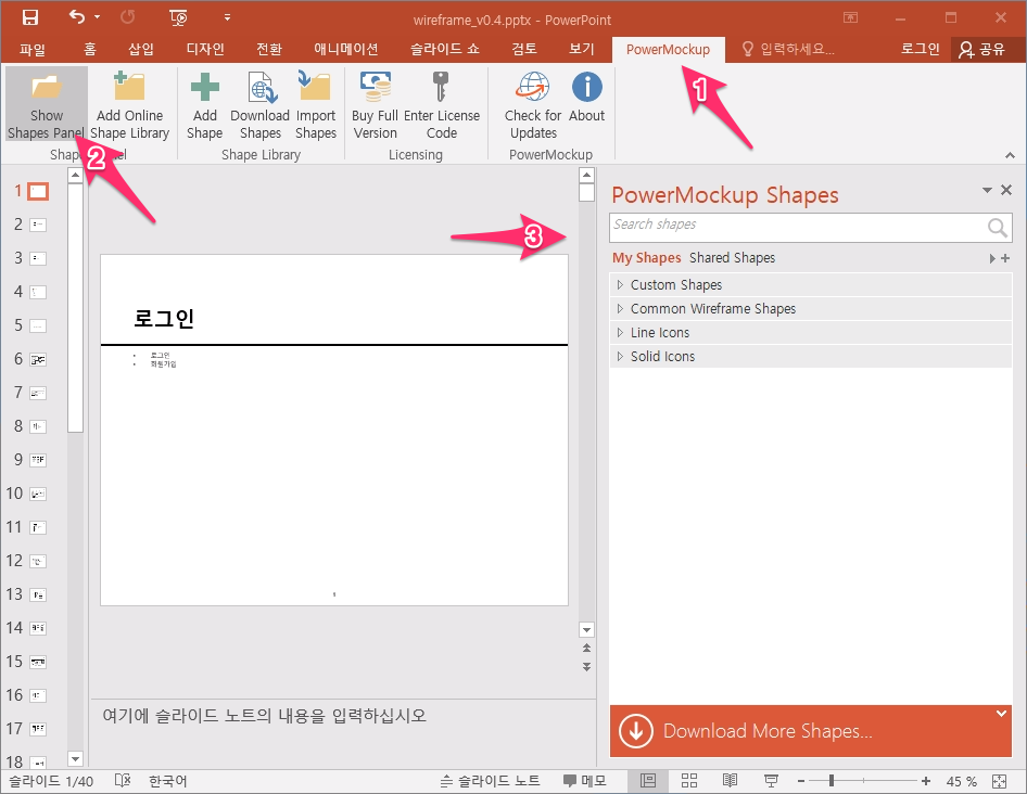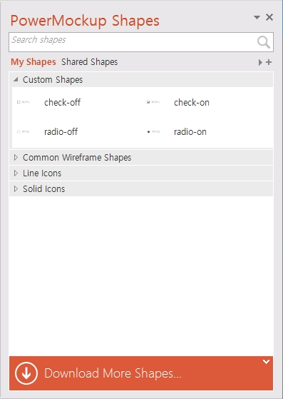 처음에 설치한 후에는 상단 메뉴 탭에서 PowerMockup을 선택 후 가장 왼쪽의 메뉴를 선택하면 문서작성에 필요한 Shapes 항목들을 확인할 수 있습니다. 하단의 Download More Shapes를 클릭하면 팝업창이 열리면서 PowerMockup에서 다운로드하여 사용 가능한 데이터들이 확인 가능합니다.