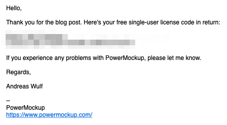 PowerMockup의 사이트를 통해 개발사에 블로그 포스팅 사실과 주소를 알려주면 정식 라이센스를 제공해 준다는 글을 보고 신청해 봤었는데 저도 성공했습니다. 아마 글의 내용보다는 어떠한 경로로든 제품에 대한 인지도를 넓히고 팀으로 구성된 유저들을 메인 타겟으로 삼고 있는 것 같습니다. 쉽지 않은 마케팅 방법이라 생각되지만 싱글 유저에겐 상당히 관대한 느낌이 듭니다. 입소문 효과 하나는 확실할 것 같습니다.