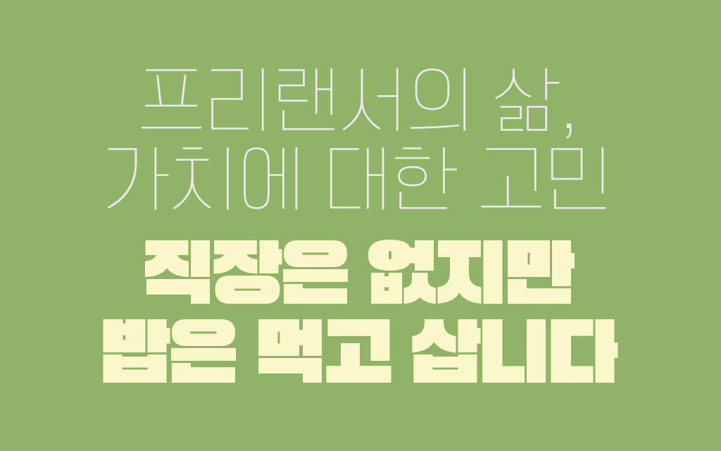 일을 구해도 계속 미끄러지면서 어쩔 수 없이 몇 개월을 놀 수밖에 없는 경우도 있었고, 괜찮은 조건이지만 출퇴근이 너무 힘들 것 같아 거절을 하기도 하고 정규직이라면 암암리에 따라야만 하던 규칙이 온전히 나를 중심으로 돌고 있기에 가능한 일들을 하면서 지내고 있습니다. 그만큼 제약사항도 많고 감수해야 하는 문제도 생기곤 하죠.