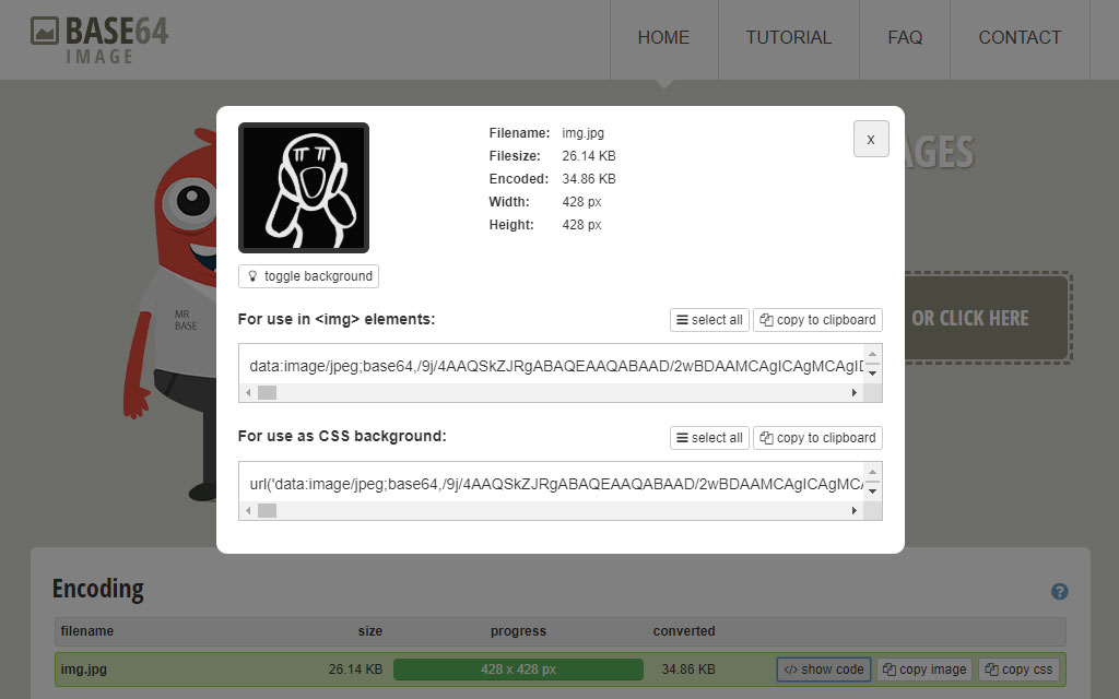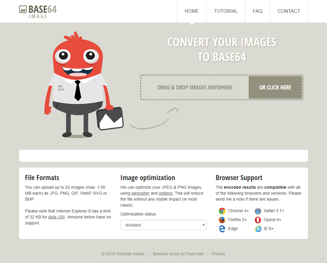 Optimize your images and convert them to base64 online. Drag & Drop your files, copy to clipboard with a click and use the result in HTML and CSS.