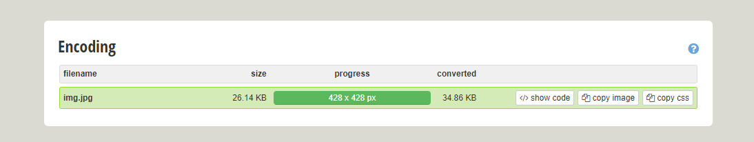 파일을 올리면 변환되는 과정과 함께 변환된 파일의 용량이 표시되며 코드를 사용할 수 있는 show code, copy image, copy css 옵션이 있습니다. 원본 사이즈가 26.14KB인데 변경되면서 34.86KB로 올라가 버렸네요. 평균적으로 원본 이미지보다 적은 사이즈를 기대하기는 힘들 것 같습니다. 비슷한 서비스를 사용해도 눈에 띌 만큼의 압축률을 기대할 수는 없어서 개인적으로는 이 서비스를 주로 사용하고 있습니다.