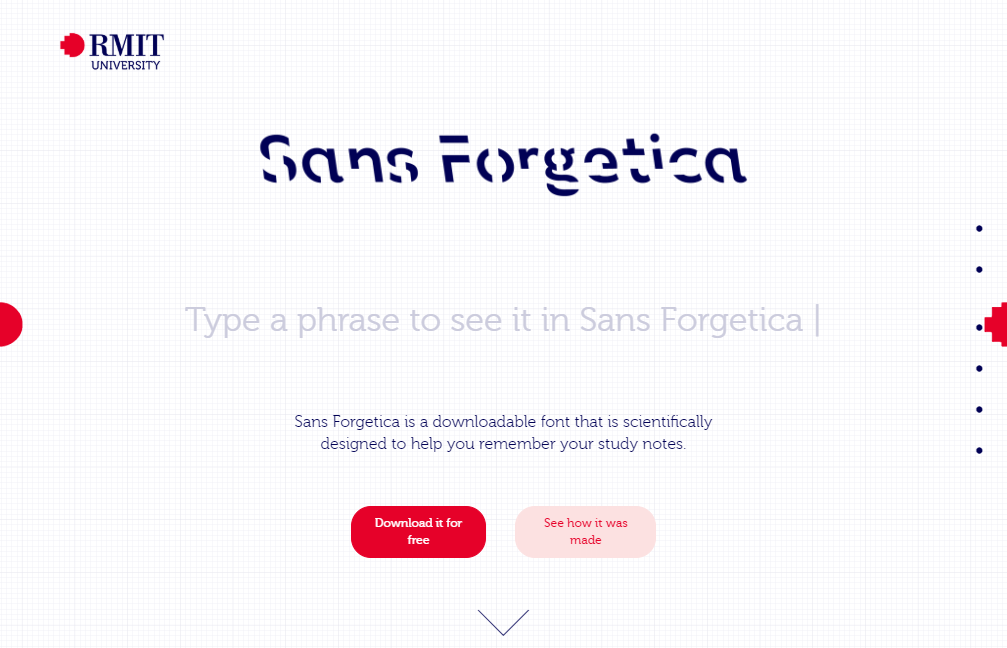 호주에 있는 RMIT 대학에서 만들어진 무료로 사용 가능한 폰트입니다. 이 폰트는 바람직한 어려움(Desirable Difficulties)이라는 인지심리학 분야의 이론을 적용한 폰트입니다. 이 이론은 편하게 얻은 정보보다 약간 노력을 들여서 얻은 정보가 좀 더 오래 기억된다는 이론이며, 이 폰트는 디지털화가 매일같이 발전되고 있는 시점에서 공부할 때 직접 손으로 쓰면서 연습하던 시대가 아닌 지금 시점에 어쩌면 필요한 폰트일지도 모르겠습니다. 힘들게(?) 손으로 쓰면서 익히는 것이 아닌, 키보드를 두드리면서 하면서도 비슷한 학습효과를 올릴 수 있는 방법을 찾던 중에 나오게 된 폰트입니다.