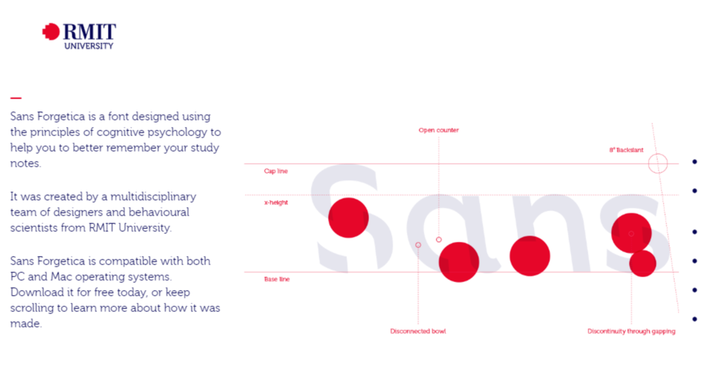 호주에 있는 RMIT 대학에서 만들어진 무료로 사용 가능한 폰트입니다. 이 폰트는 바람직한 어려움(Desirable Difficulties)이라는 인지심리학 분야의 이론을 적용한 폰트입니다. 이 이론은 편하게 얻은 정보보다 약간 노력을 들여서 얻은 정보가 좀 더 오래 기억된다는 이론이며, 이 폰트는 디지털화가 매일같이 발전되고 있는 시점에서 공부할 때 직접 손으로 쓰면서 연습하던 시대가 아닌 지금 시점에 어쩌면 필요한 폰트일지도 모르겠습니다. 힘들게(?) 손으로 쓰면서 익히는 것이 아닌, 키보드를 두드리면서 하면서도 비슷한 학습효과를 올릴 수 있는 방법을 찾던 중에 나오게 된 폰트입니다.