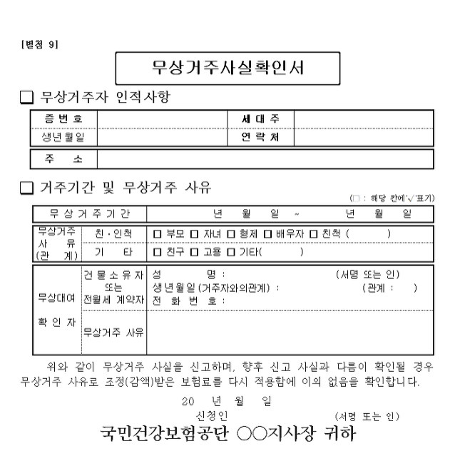 - 무상거주사실증명서(인터넷 또는 건강보험 사무실에서 작성)