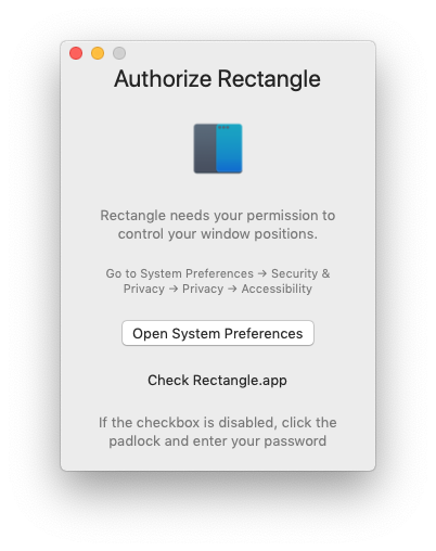 설치 후에는 System Preferences의 Privacy에서 Rectangle을 체크해줘야 최종적인 설치가 마무리되었다고 할 수 있겠습니다.