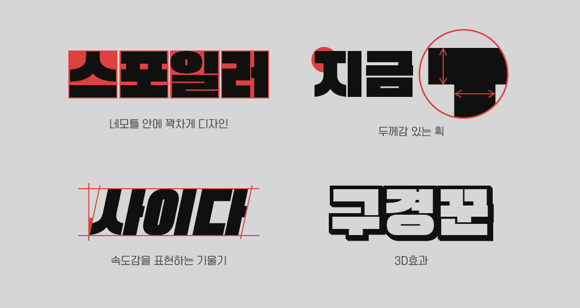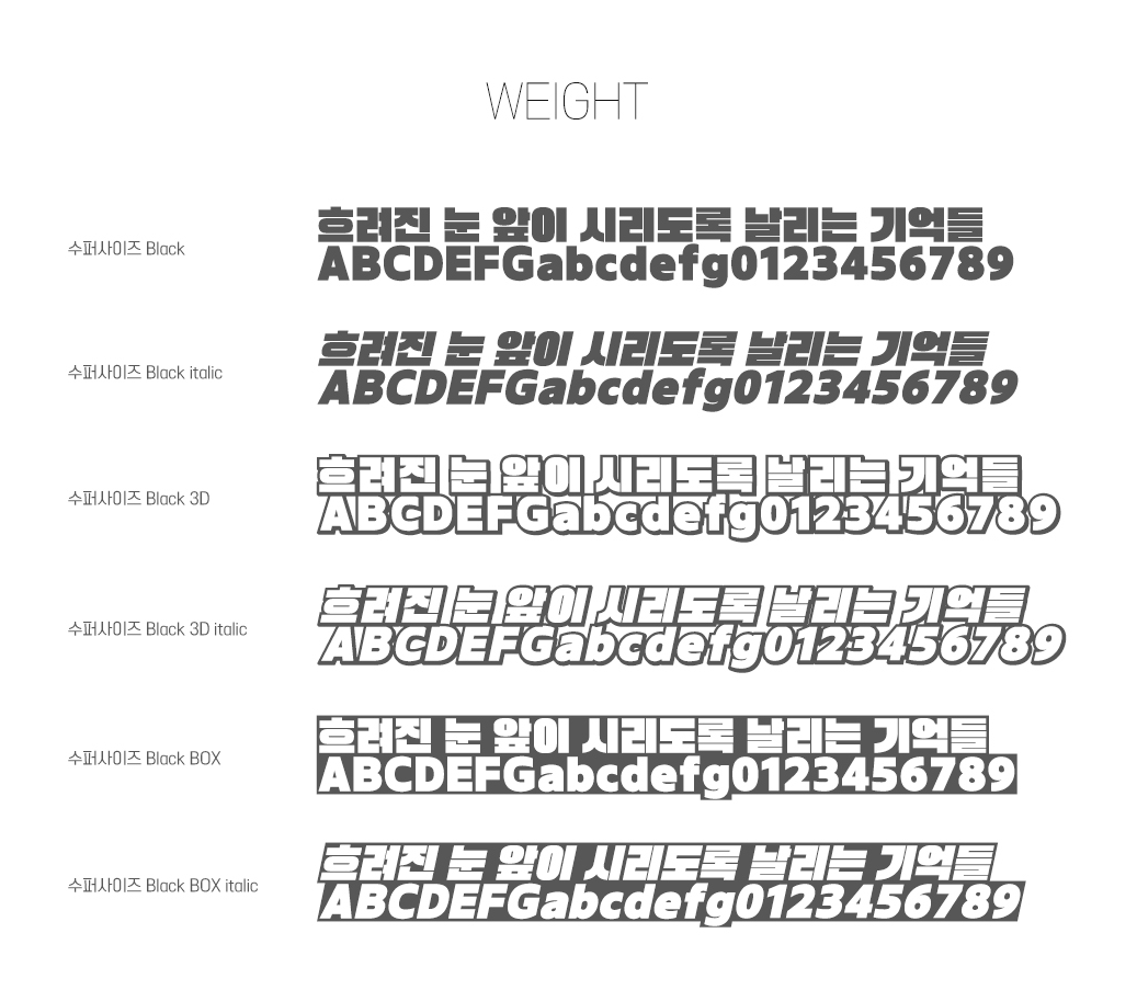 슈퍼사이즈는 기본 폰트인 Black을 시작해서 italic, 3D, Black BOX 등의 패밀리로 구성되어 있는 무게감 있는 폰트입니다. 두께감이 있기 때문에 자체적으로 가지고 있는 임팩트는 자연스럽게 시선을 모을 수 있습니다.