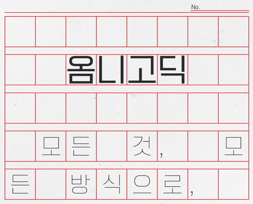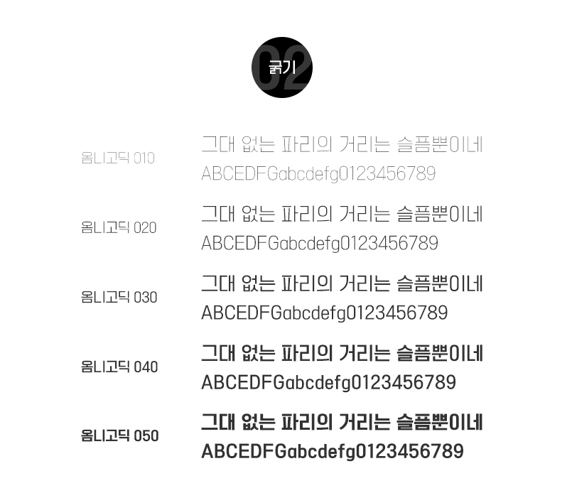 옴니고딕의 옴니(omni-)는 모든 것이라는 뜻을 가지고 있으며 가독성을 중점으로 제작된 본문용 서체로 제작되었지만 다양한 용도로 사용 가능합니다. 공간과 여백 활용이 잘 잡혀 있는 균형감 있는 폰트로 깔끔함이 돋보이는 폰트입니다.