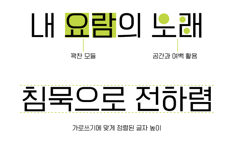꽉 찬 모듈에서 안점감이 느껴지며 공간, 여백의 활용면에서 시원한 느낌을 주는 폰트입니다.