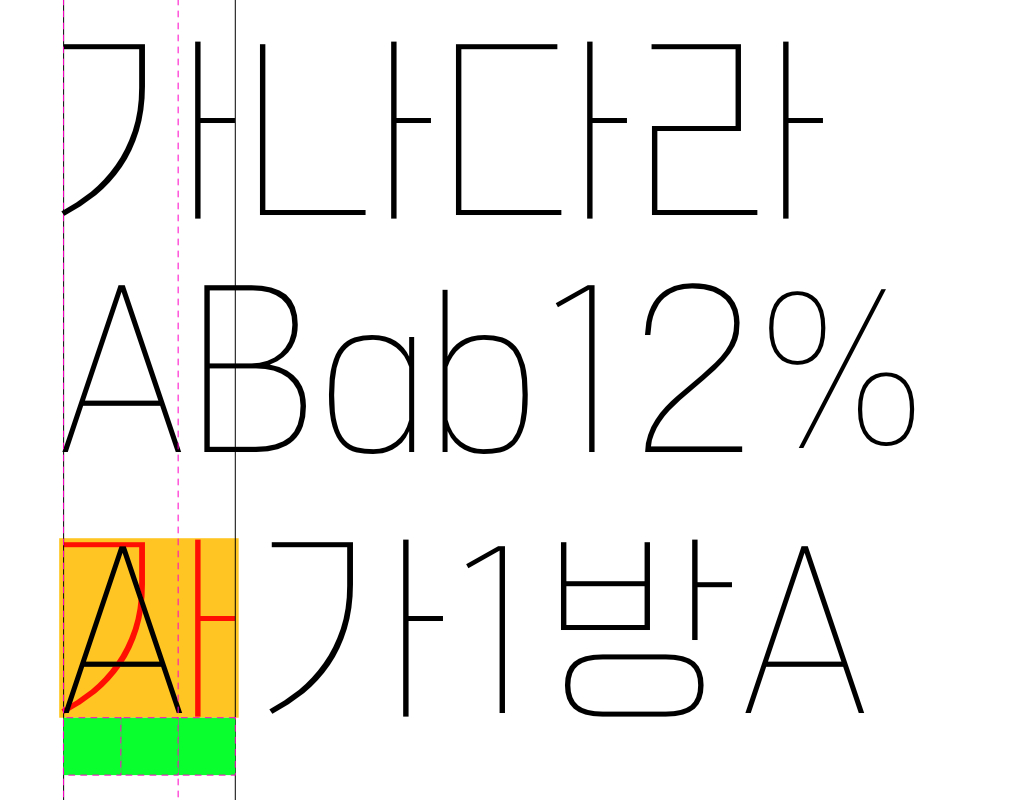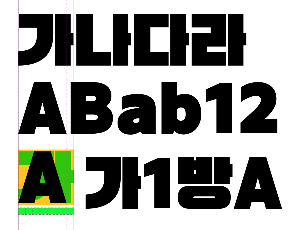 한글의 폭과 영문의 폭에서 차이가 있습니다. 정확하진 않지만 대충 어느정도 차이인지 눈대중으로 파악 가능할 것 같습니다. 영문과 숫자의 경우 일반적으로 한글보다 높이와 폭에 차이가 있어서 편집 과정에서 조금씩 키우는 작업을 병행해서 잡아주는 과정이 필요한데 폰트를 본격적으로 공부해 보지 않은 입장에서 봤을 때 근본적으로 이런 과정을 없애는 건 어떨까 싶기도 하네요.