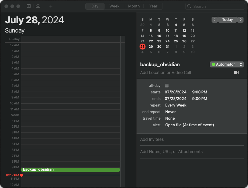 원하는 곳에 저장되는 것을 확인 후, 저장을 하게되면 캘린더가 실행되며 날짜와 시간을 설정할 수 있게 되는데 1~2분 뒤로 설정하고 한 번 더 테스트. 잘 작동하는 것이 확인되었으면 이후 반복일정 등을 지정하면 된다. 실험 삼아 매주 일요일 저녁 9시에 실행되도록 했다.