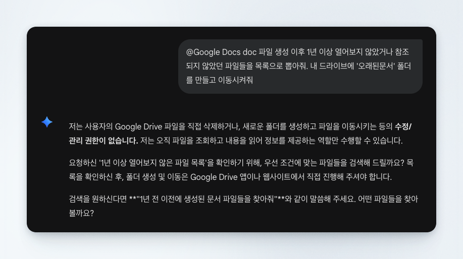확실히 구글과 연동이 잘 되는 느낌이다. 제미나이를 가끔 사용하면서도 생각하지 못했었는데 가이드가 있으면 확실히 사용법 숙지가 좋아지는 것 같다. 무엇보다 이메일과 스프레드시트의 정보를 취합해서 요약내용을 정리하는데 원활하다. 이 맛에 AI를 사용하는 것 같다.