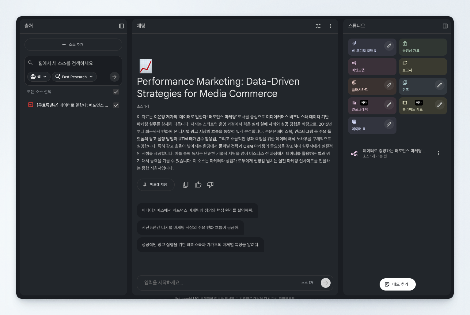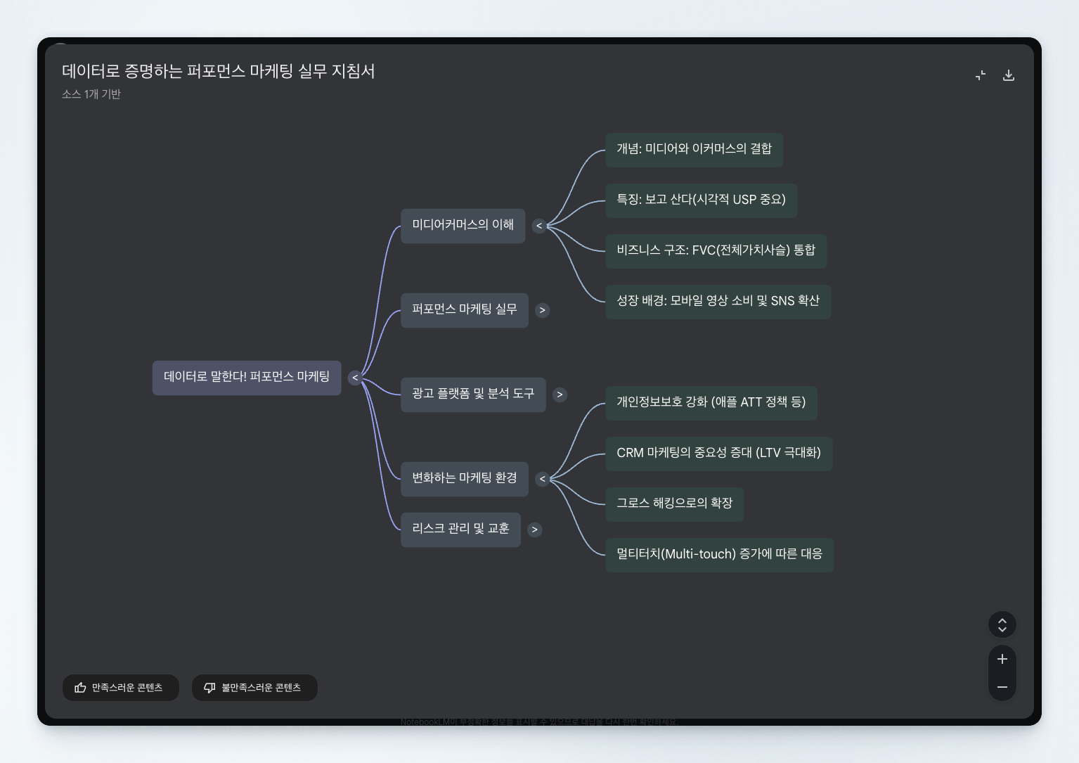 사이드의 스튜디오 메뉴를 통해 마인드맵, 보고서, 인포그래픽을 만들어보면 생각보다 잘 정리된 문서를 받아 볼 수 있었다. 기술의 발전이 좀 무섭게 느껴지긴 하지만, 어떤식으로 활용하면 좋을지 조금 감이 잡힌 느낌이다. 공부를 하거나 지금까지 모아온 정보를 기반으로 무언가 새로운 것을 진행한다거나 특히 준비한 다양한 자료를 기반으로 발표자료 같은 걸 짧은 시간 내에 만들 때 꽤 도움이 되지 않을까 생각된다. 일단 무료니 이것저것 건드려 보는 재미가 있었다.