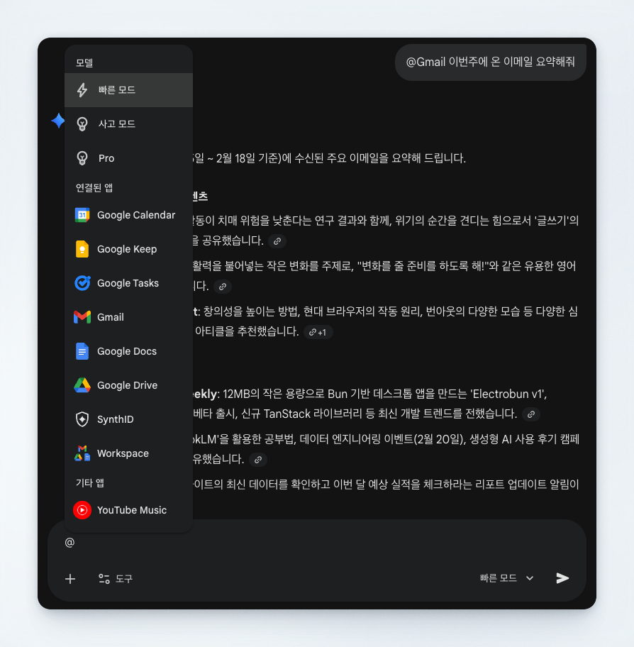 @를 사용하면 구글서비스와 연계해서 사용가능하다. 이메일 요약이나 구글 드라이브에서 작성한 스프레드시트에서 정보를 취합할 수도 있어 매우 훌륭한 사용방법 중 하나라 생각된다. 구글 서비스를 이용하고 있는 사람이라면 조금씩이라도 활용도가 있을 법하다. 이런 서비스가 기본적으로 무료로 이용 가능하니 사용하지 않을 이유는 없겠다.