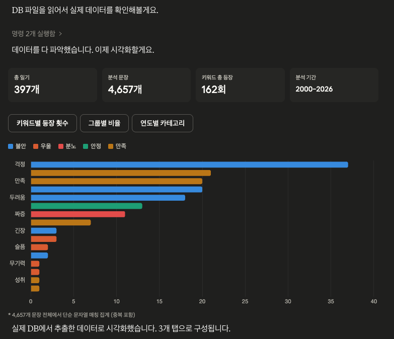 무엇을 만들어볼까 고민하다가 과거의 기록들을 꺼내보았다. 중간중간 아날로그로 쓰다가 컴퓨터로 쓰다가 지금은 다시 아날로그 감성이 좋아 수기 다이어리로 돌아갔지만, 예전에 디지털로 남겼던 텍스트 일기들의 '감정 상태'를 시각화해 보면 재미있을 것 같았다. 데이터가 더 방대했다면 훨씬 정교하고 유의미한 결과가 나왔겠지만, 짧은 기간의 데이터만으로도 꽤 흥미로운 통찰을 얻을 수 있었다. 클로드 코드로만 전 과정을 진행한 것은 아니었지만, 최종적으로 추출된 JSON 데이터를 기반으로 시각화를 지시하고 수정해 가는 과정 자체가 재미있는 경험이었다.