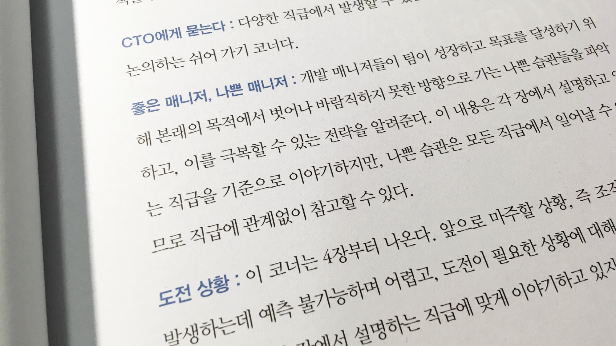 책의 원서의 배경이 외국인만큼, 국내 실정과는 거리가 있는 내용이 있기도 합니다. 프로그램, 개발자 직군은 아니지만 IT업에 종사한 지 경력이 좀 있다 보니 책에서 다루고 있는 PL 업무를 보게 되는 경우도 종종 있습니다.
