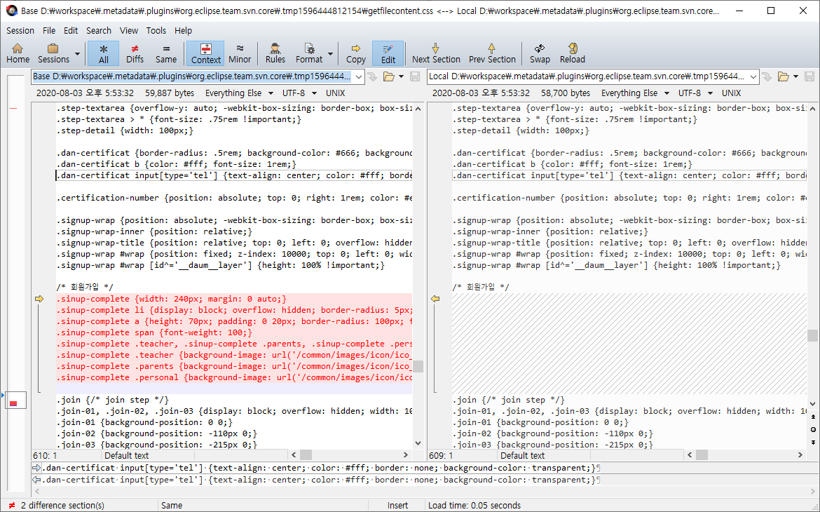 프로젝트에서 주로 사용하는 것이 Eclipse이다 보니 Diff 툴도 기본으로 지원하는 녀석을 사용해 오고 있었는데 Beyond Compare를 설치했으니 기본 설정을 바꿔봤습니다. Eclipse에서는 제대로 보이지 않던 녀석들이 컬러풀(?)하게 지원되니 확인하기도 편하고 뭔가 시각적으로 만족감이 높아지는 것 같았습니다.