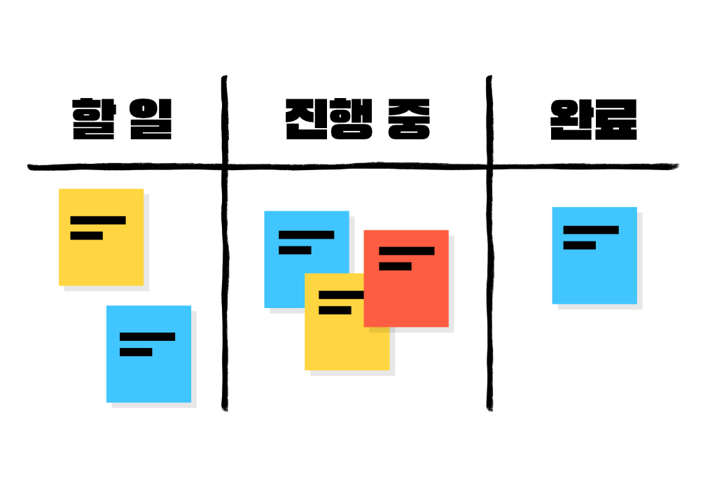 칸반은 적용하기가 무척 수월하다. 다음과 같이 할 일, 진행 중인 일, 마무리된 일로 나누면 끝.