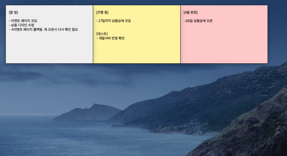 나 같은 경우, 이런저런 서비스를 사용해 봤지만 초반에 반짝 사용하다 흐지부지 되는 경우가 많이 있었는데 항상 프로그램을 실행시켜 두어야 하거나 계속 접속해야 하는 번거로움(?) 때문이라 여겨진다. 지금은 개인 업무의 경우 다른 방법으로 항상 확인할 수 있도록 포스트잇을 사용하고 있다. 사무실에서 사용 중인 화면은 준비할 수가 없지만 대충 다음과 같은 형식으로 기본 설치되어 있는 포스트잇 프로그램을 사용하여 업무를 관리하고 있다.
