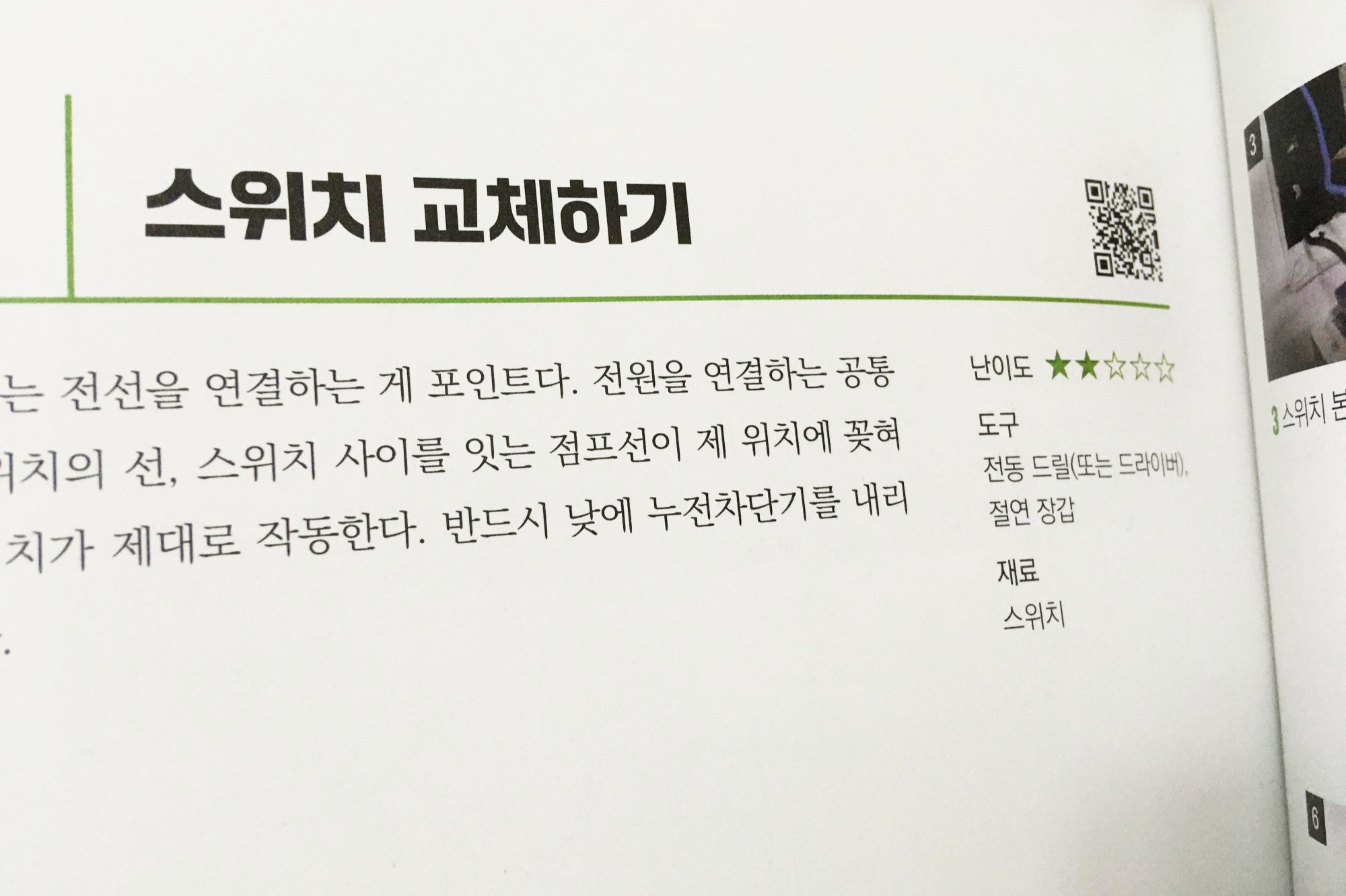 혼자서 할 수 있는 부분과 그렇지 않은 부분(무겁거나 너무 크거나)이 조금 있겠지만 인건비를 절약할 수 있는 선에서 안내해 주고 있는 것 같다. 첫 장은 집수리에 필요한 공구들과 사용법에 대해 다루고 있고 크게 방과 거실, 주방, 욕실, 창문, 전기 설비, 현관과 발코니, 옥외 등 7개의 공간별로 각 장이 구성되어 있다. 전기설비는 제일 건들기 어려운 부분이라 생각되었는데 책을 보면 따라 하면 간단한 작업은 수월하게 작업이 가능할 것 같다.