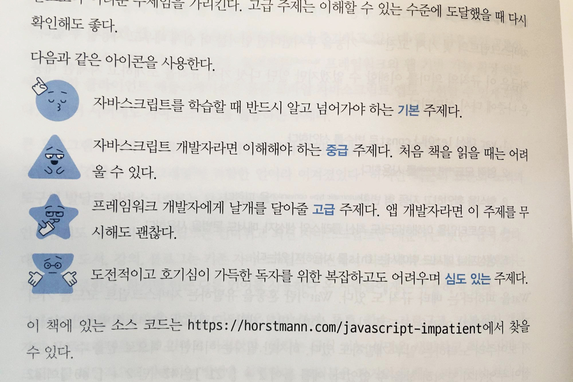우선은 기본항목들만 읽어봐도 좋고 이미 기본기가 있는 사람들은 기본과 중급 주제를 보거나 고급에서 다루는 내용을 읽어보는 것도 좋게다. 실질적으로 학습효과를 올리기 위해선 본인의 실력보다 위에 있는 내용을 파악하면서 익히는게 좋다고 생각한다. 용도에 맞게 책을 활용하면 좋을 것 같다.