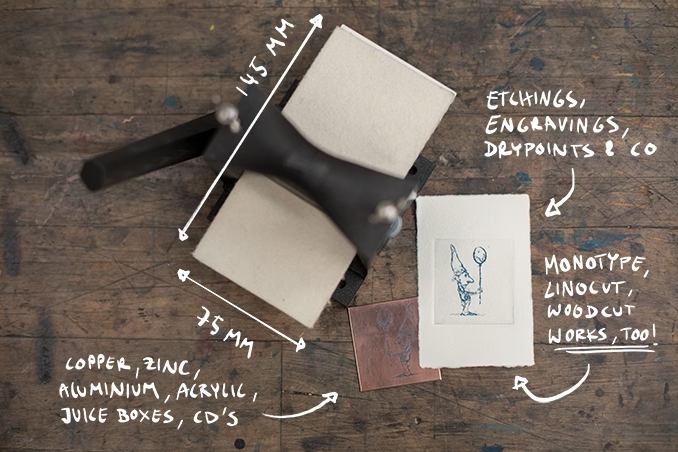 Use printmaking for your art whenever and wherever you want. This little 3D-printed press fits into your backpack and gives you the ability to print outside, on vacation or in your living room! We are on a mission to make printmaking accessible to everyone