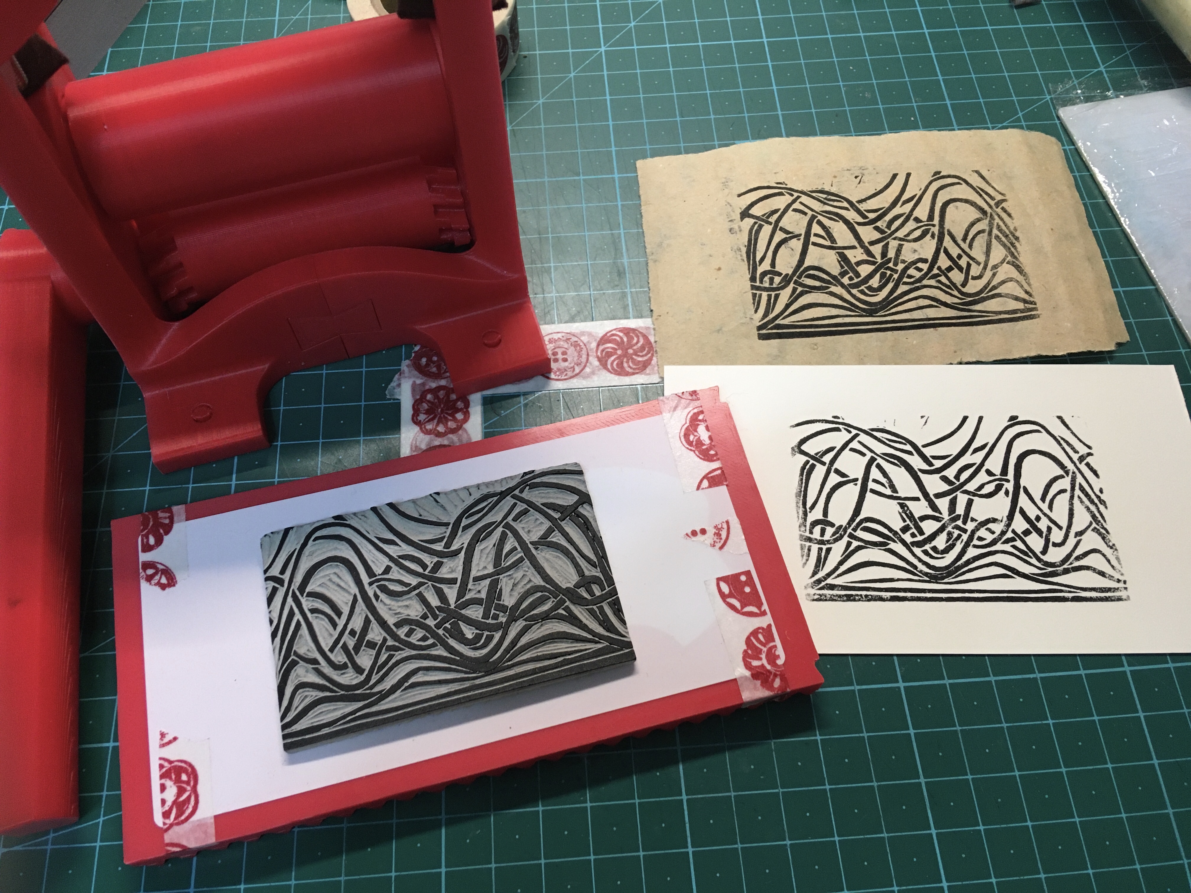 높이 조절과 함께 판을 돌릴때 밀어 넣으니 들어가는 쪽은 잘 찍힌 게 확인되지만 뒤쪽, 나오는 쪽에서 다시 힘이 제대로 받혀지질 못한다. 리놀륨판의 두께 때문에 아직은 압력조정이나 손잡이를 돌리는 작업이 수월치 않다. 좀 더 만져봐야 알겠지만 일단 여기까지.
