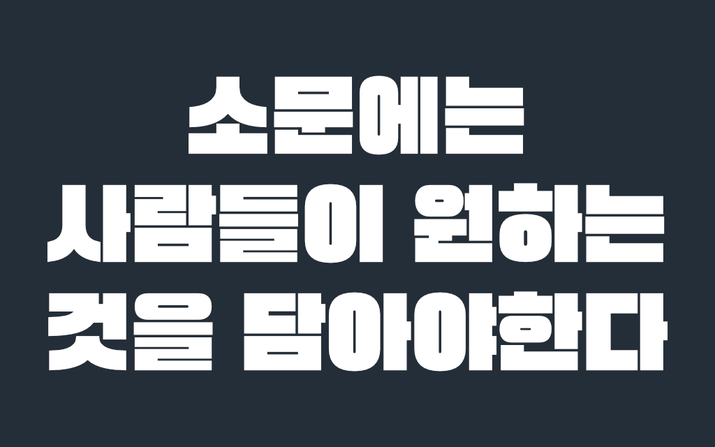 누구나 나만 알고 싶은 것이 있는가 하면 누군가에게 알리고 싶어 입이 근질거리는 것이 있다. 바로 이런 입이 근질거리게 만드는 방법들을 연구하고 질 좋은 상품, 서비스를 만들어 낸다면 좋을 것 같다.