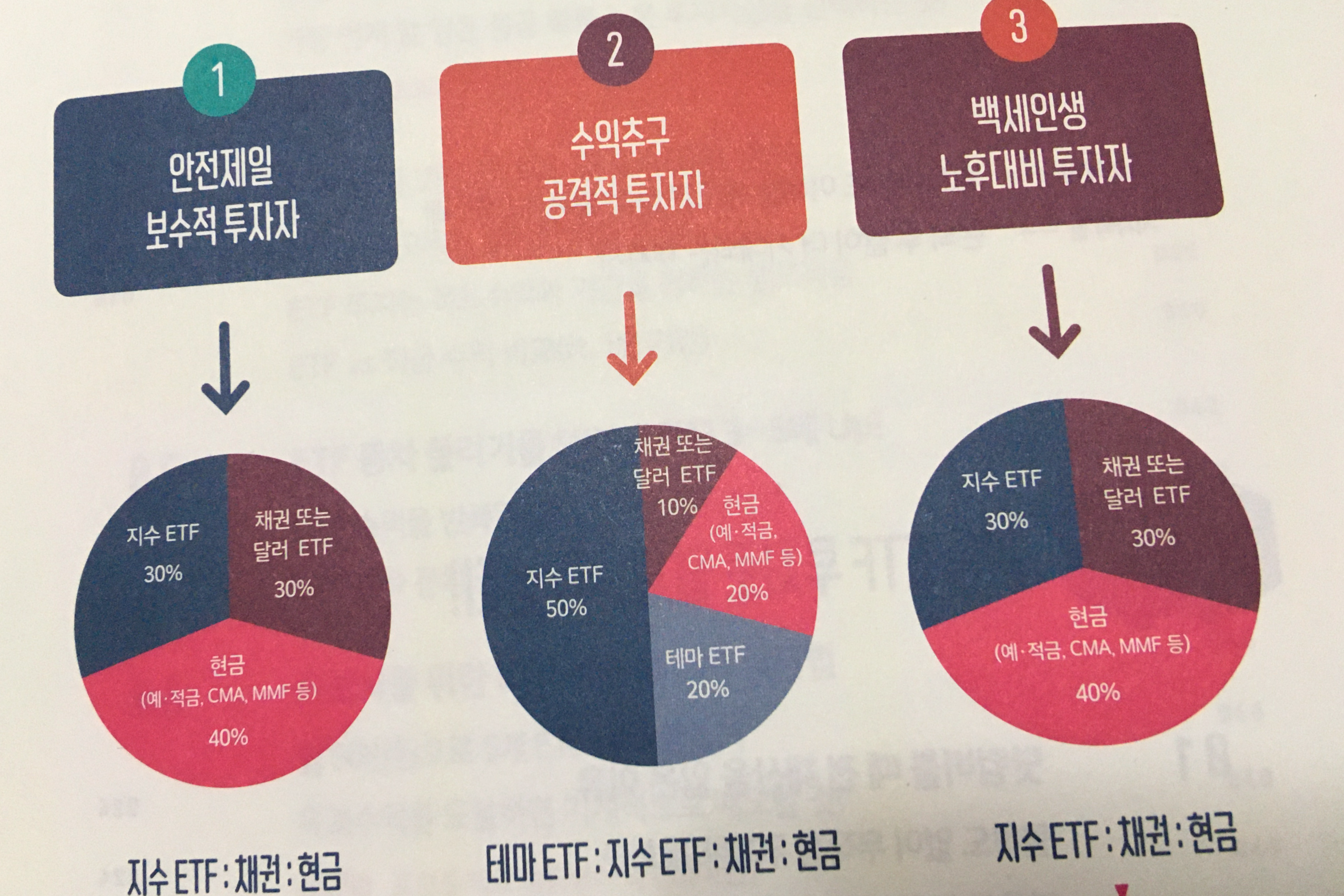 책에서는 투자 유형에 따라 안전제일(보수), 수익추구(공격), 백세인생(노후대비)의 3가지 유형을 대상으로 포트폴리오에 대한 제안을 해주고 있다. 안전제일과 백세 인생은 동일한 비율을 가지고 있고 수익추구형만 비율이 상이하다. 역시 현금의 비중은 무시할 수 없다. 현금이, 총알이 있어야 매수할 수 있으니 당연한 이야기겠지만.
