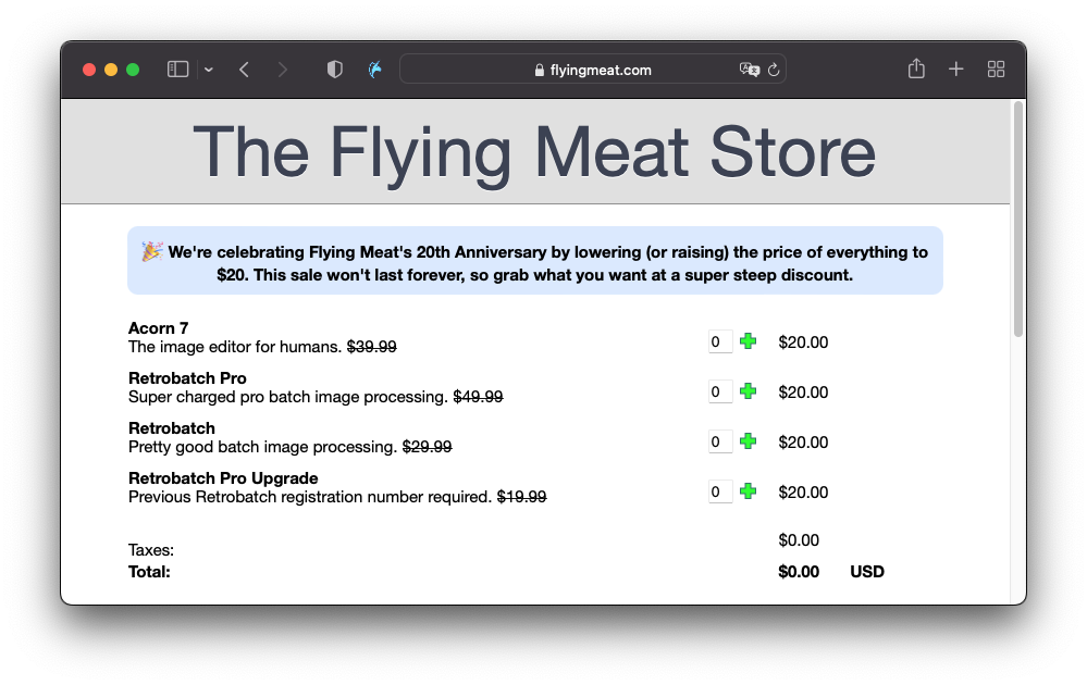 🎉 We're celebrating Flying Meat's 20th Anniversary by lowering (or raising) the price of everything to $20. This sale won't last forever, so grab what you want at a super steep discount.