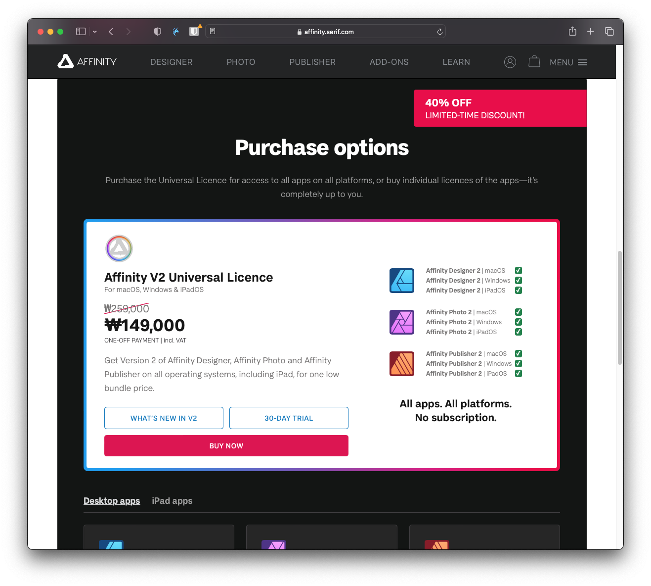 어피니티(Affinity)의 버전 2가 판매를 시작했다. 탈 어도비를 꿈꾸는 이들 사이에서 인기를 끌던 프로그램이 드디어 버전 2가 나오게 되었는데 프로모션으로 40% 세일을 진행하기에 구매했다. (페이팔에 $10가 있어서 총 $89.99에 구매할 수 있었으니 좀 더 이득 본 느낌적인 느낌?)