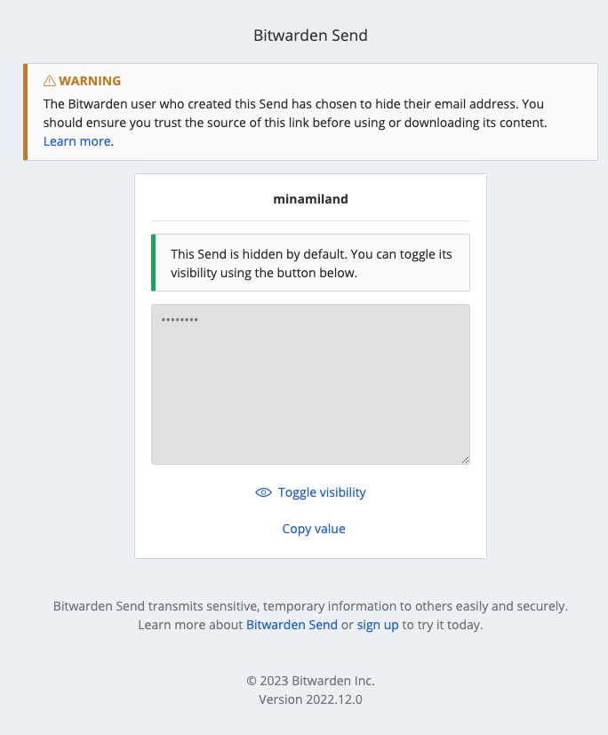 비밀번호를 입력하게 되면 나오는 화면에서 전송된 메세지를 확인할 수 있는데 이메일을 숨기면 경고 메시지가 함께 나온다. 본문 텍스트를 숨김처리했을 경우 하단의 Toggle visibiliy를 선택하면 텍스트가 표시된다.