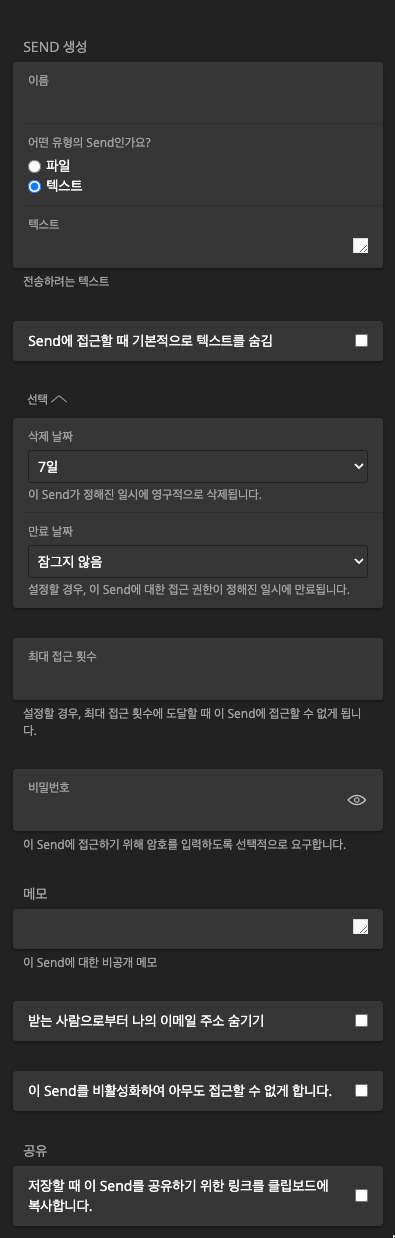 Send의 기능 설정을 보면 보내는 사람의 이름과 파일인지 텍스트인지 정할 수 있는데 파일은 프리미엄 사용자만 가능하다. Send로 받은 내용을 확인할 때 기본적으로 텍스트를 숨김여부를 정할 수 있고, 자동으로 전송된 내용이 삭제되도록 1시간부터 설정가능했다. 최대 접근 횟수까지 가능하고, 비밀번호도 설정가능하고, 보내는 사람의 이메일도 숨기는 게 가능하다.