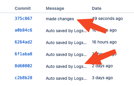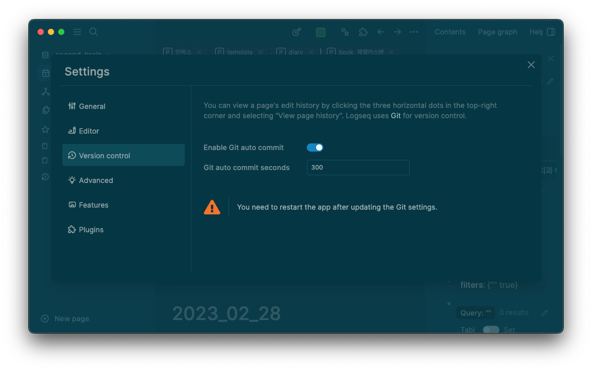 Logseq에서 제공되는 옵션으로 자동 저장되는 부분은 'Auto saved by Logseq'라고 커밋 메시지가 생성되고 자동 생성되는 시간과 관계없이 저장과 커밋을 한 경우에는 따로 설정한 메시지가 표시된다. 자동 저장은 Logseq의 Version control 옵션에서 시간 설정이 가능하다.