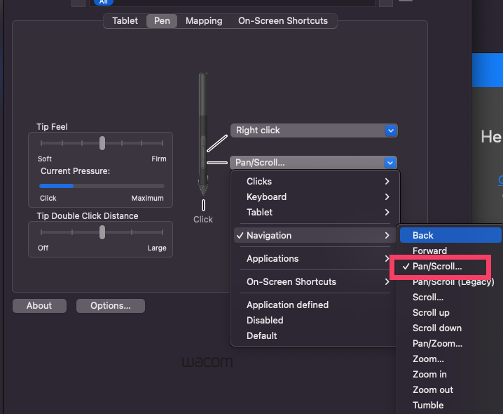 스크롤을 위해 Pan/Scroll을 설정. 이 설정은 클릭 후 드레그를 통해 스크롤을 구현해 주는 기능이다. 태블릿에서 제공되는 확장키 기능을 사용해서도 가능하지만 위치가 적합하지 않아 현재 방법으로 설정해 두었다. 키보드에 해당 기능을 맵핑 가능하다면 편할 것 같은데 아직 그 방법은 찾지 못하고 있다.