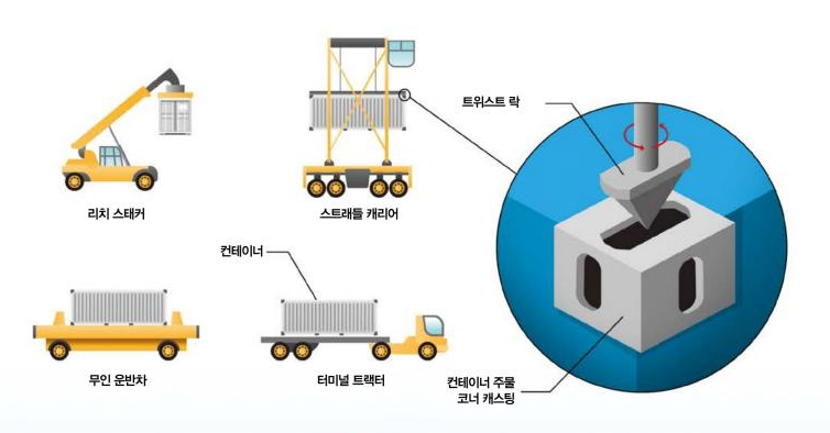 뉴스 등을 통해 컨테이너가 올라가는 것을 보며 위험한 그낌을 지울 수 없었다. 저렇게 그냥 들어 올린다고? 어떤 식으로 고정시키고 있을까 궁금했었는데 이 그림 한 장으로 그 궁금증이 해소되었다. 트위스트 락이 있다면 위험해 보이지만 사방을 고정 시킴으로 안전성을 올릴 수 있는 것이었다.